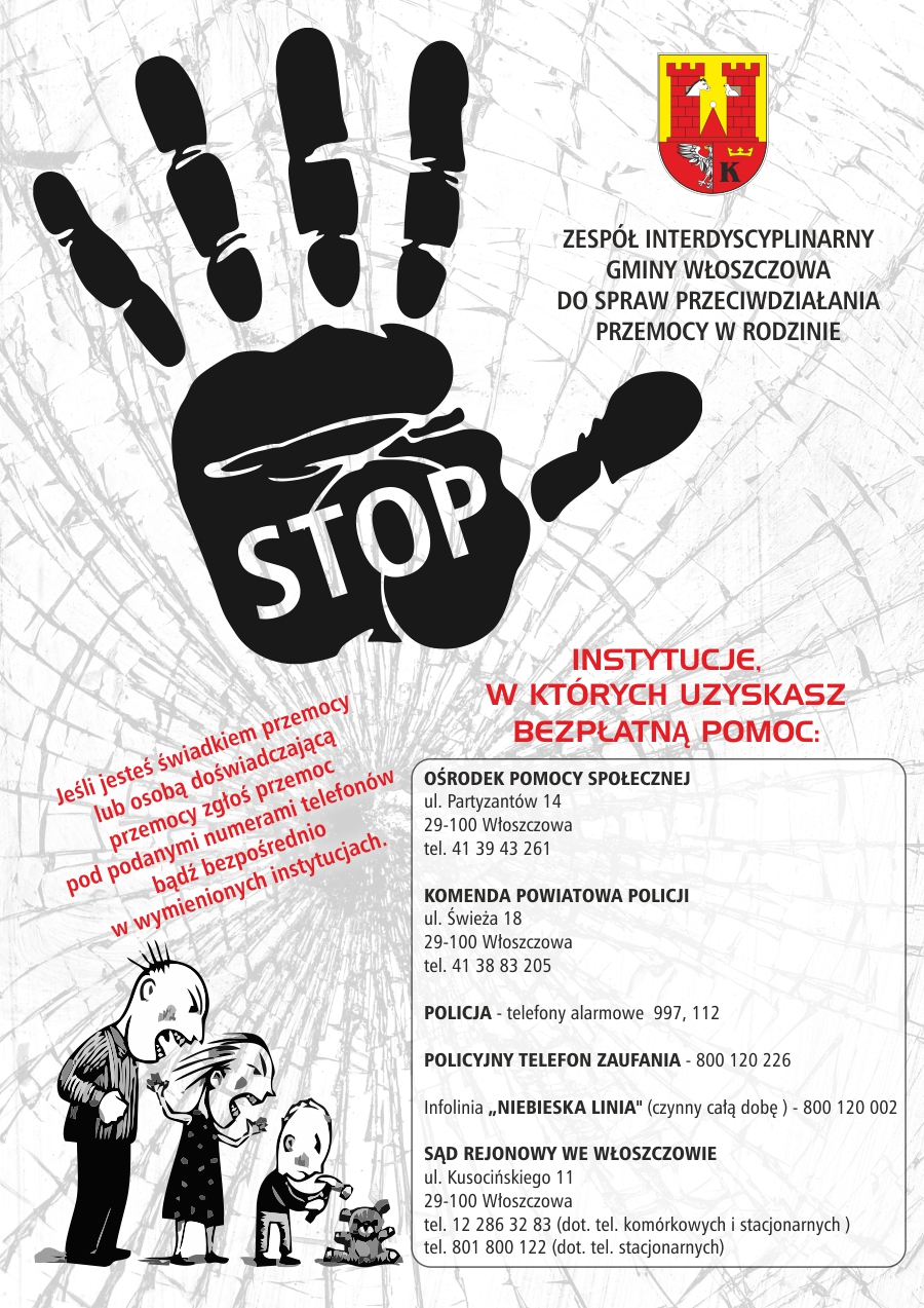Zespół Interdyscyplinarny Gminy Włoszczowa ds. przeciwdziałania przemocy w rodzinie został powołany przez Burmistrza Gminy Włoszczowa. W/w Zespół tworzą przedstawiciele instytucji określonych w art. 9a ust. 3 ustawy o przeciwdziałaniu przemocy w rodzinie tj. jednostek organizacyjnych pomocy społecznej, gminnej komisji rozwiązywania problemów alkoholowych, Policji, oświaty, ochrony zdrowia, oraz kurator sądowy.