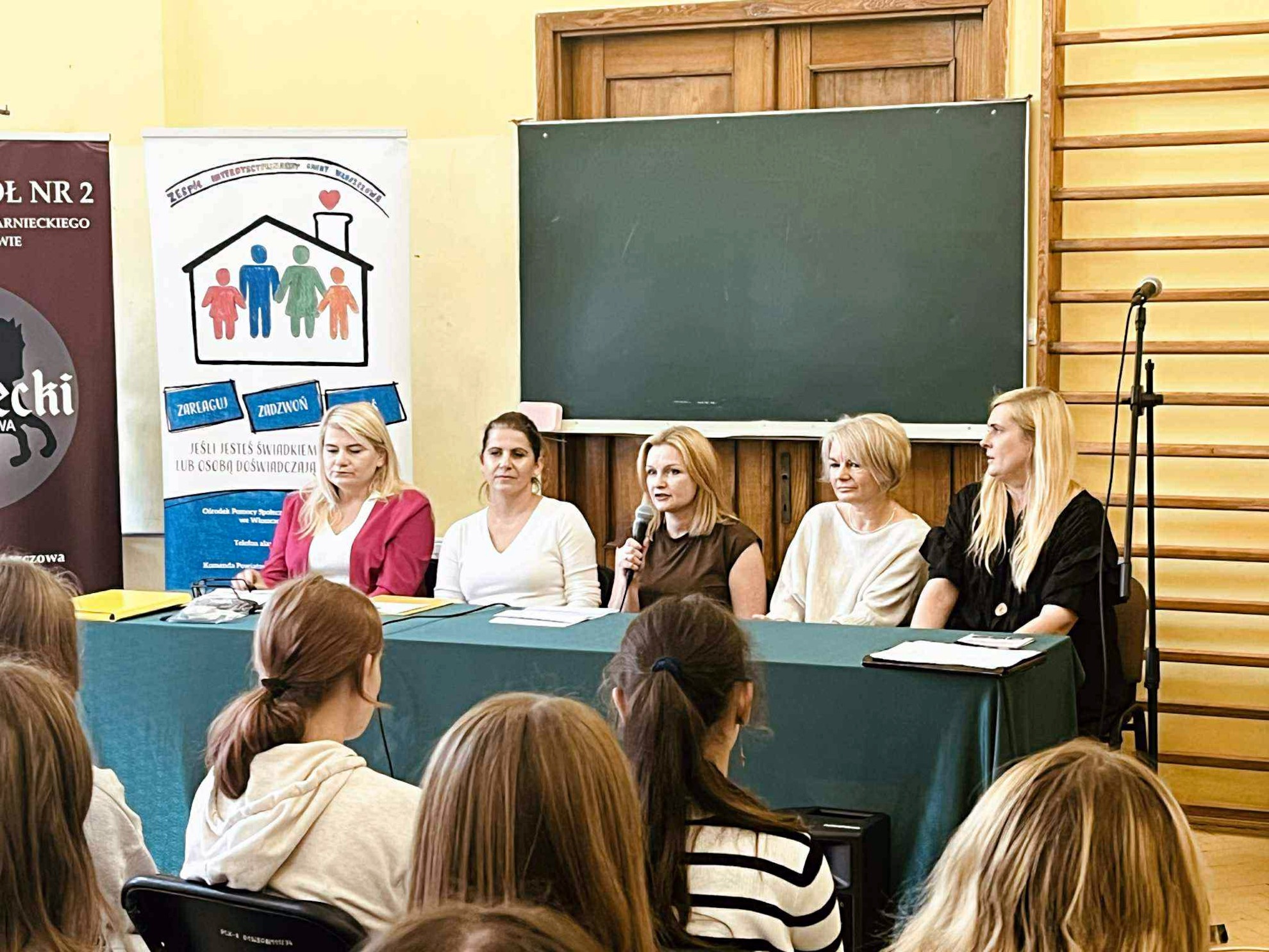 Na zaproszenie Zespołu Szkół nr 2 we Włoszczowie im. Hetmana Stefana Czarnieckiego w związku z Tygodniem Przeciwdziałania Przemocy Rówieśniczej przewodnicząca oraz zastępca Zespołu Interdyscyplinarnego Gminy Włoszczowa wraz z Panią dyrektor Ośrodka Pomocy Społecznej we Włoszczowie uczestniczyli w prelekcji omawiając różne formy przemocy, a także metody przeciwdziałania i możliwości uzyskania wsparcia W ramach spotkania uczniowie mogli zobaczyć wystawę prac fotograficznych wykonanych podczas realizacji projektu „Spójrz w oczy Przemocy”.