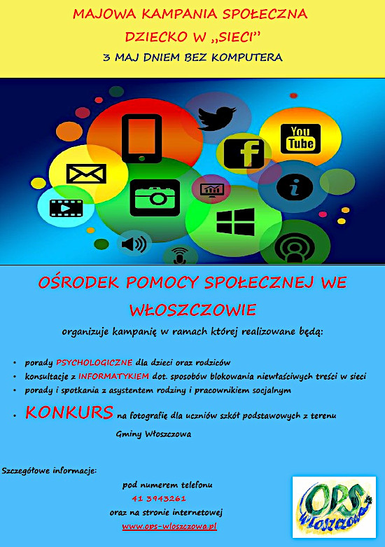 Ośrodek Pomocy Społecznej we Włoszczowie organizuje kampanię społeczną pn. Dziecko w „sieci”. Realizacja przewidziana jest na miesiąc maj w związku z Dniem bez komputera , który obchodzony był 3 maja.