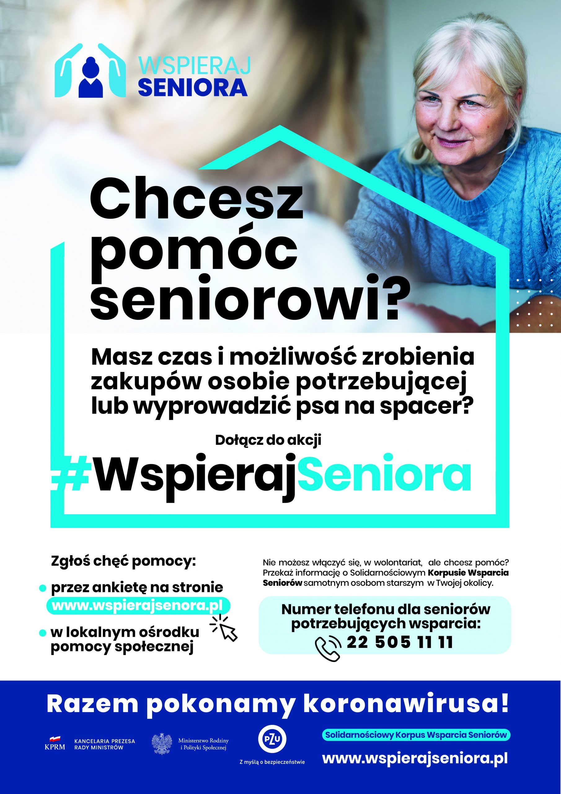 Ośrodek Pomocy Społecznej we Włoszczowie w trudnych czasach szalejącej epidemii koronawirusa nie pozostawi seniorów bez wsparcia. Ze względu na wzrastające niebezpieczeństwo zakażenia koronawirusem, dbając o dobro naszych najstarszych mieszkańców, gmina Włoszczowa przystąpiła do rządowego programu „Wspieraj seniora”. Jest to program realizowany przez Ministerstwo Rodziny i Polityki Społecznej, którego celem jest zapewnienie usług wsparcia seniorom w wieku 70 lat i więcej.