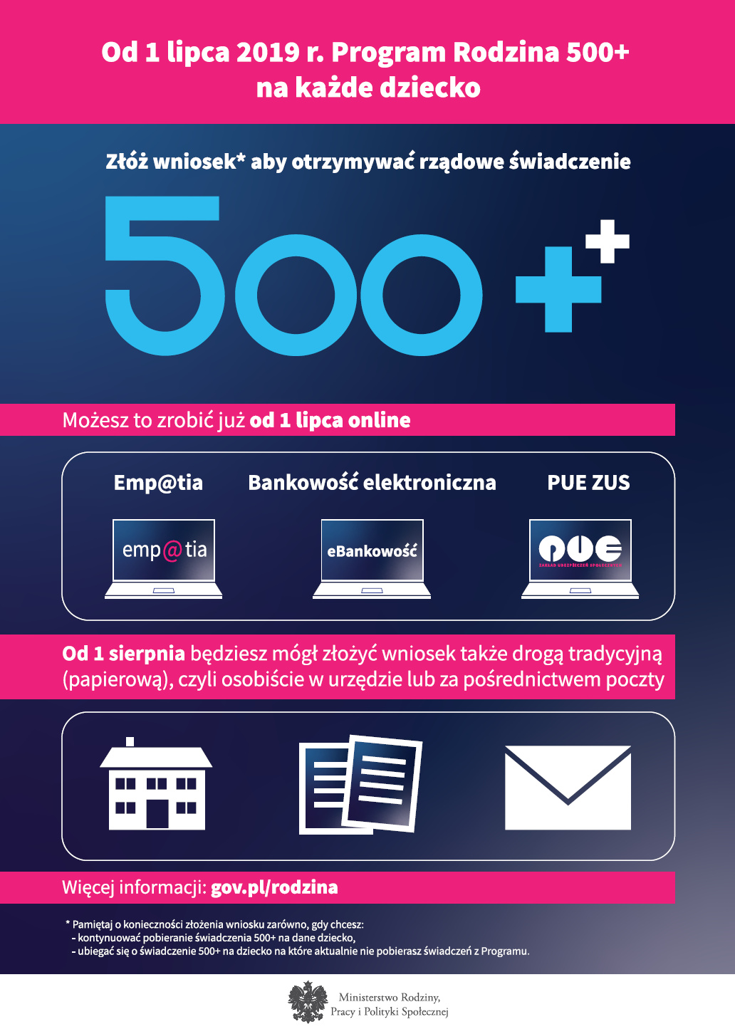 • oraz PUE ZUS – Platformy Usług Elektronicznych ZUS (wyłącznie wnioski o świadczenie wychowawcze 500+). Jeżeli wniosek o świadczenie wychowawcze 500+ zostanie złożony w okresie od 1 lipca 2019 r. do 30 września 2019r. (dotyczy świadczeń na dzieci, które dotychczas nie były objęte programem) świadczenie zostanie przyznane z wyrównaniem od 1 lipca 2019r.