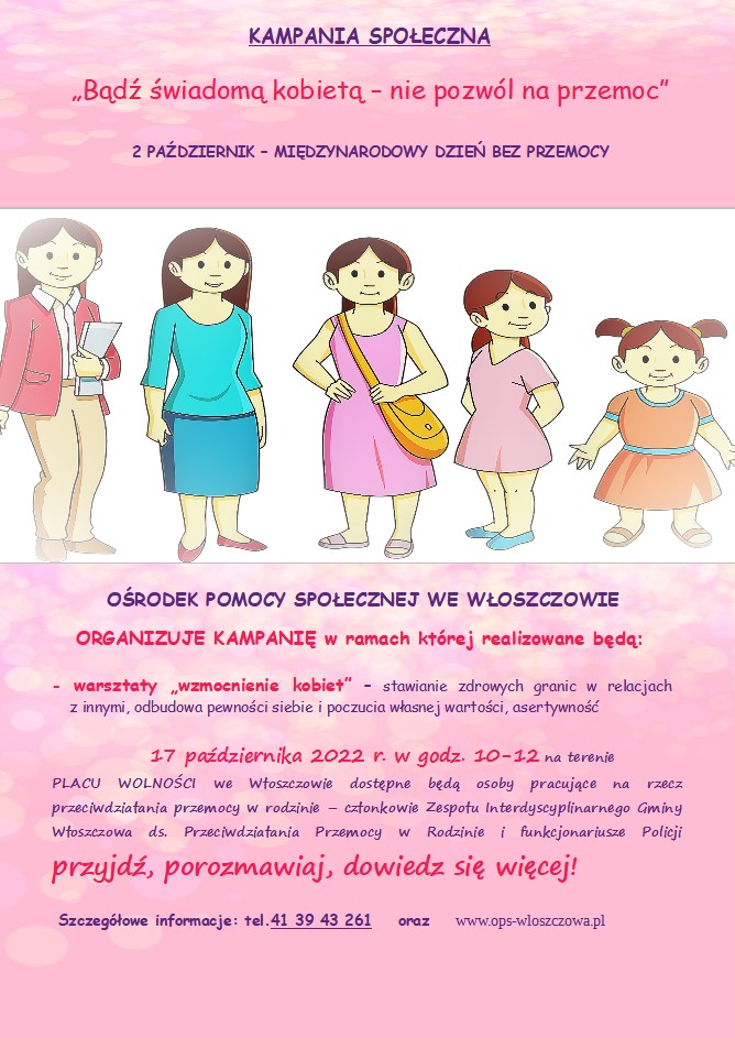 W związku z Międzynarodowym Dniem bez Przemocy przypadającym na dzień 2 października – Ośrodek Pomocy Społecznej we Włoszczowie organizuje w miesiącu październiku kampanię społeczną pt. „Bądź świadomą kobietą – nie pozwól na przemoc”. W ramach kampanii odbędą się warsztaty pn. „wzmocnienie kobiet”, podczas których kobiety doświadczające przemocy lub zagrożone przemocą w rodzinie, będą mogły zdobyć wiedzę na temat stawiania granic w relacjach z innymi. Dowiedzą się jak odbudować pewność siebie oraz poczucie własnej wartości, poznają tajniki asertywności.