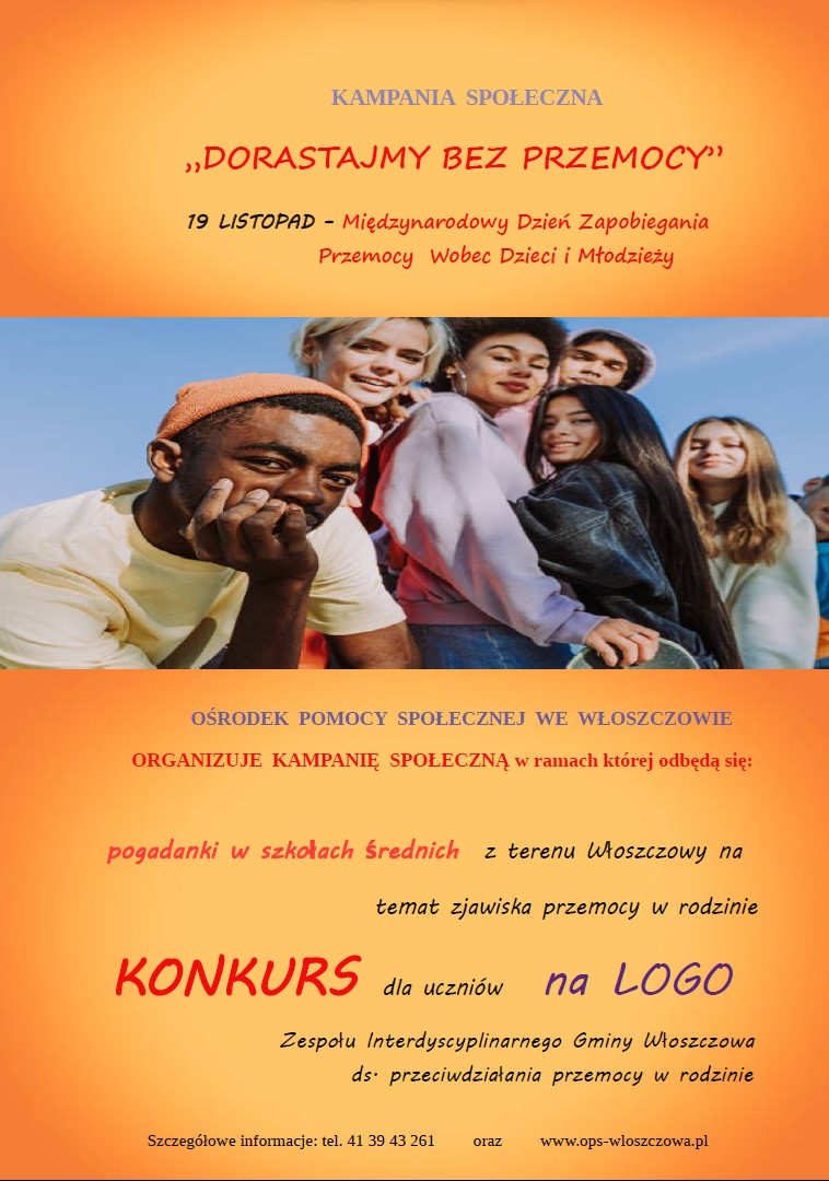 Od dzisiejszego dnia, czyli 16 listopada 2022 r. rozpoczyna się konkurs plastyczny dla uczniów szkół średnich we Włoszczowie na LOGO Zespołu Interdyscyplinarnego Gminy Włoszczowa ds. Przeciwdziałania Przemocy w Rodzinie. Konkurs organizowany jest w ramach naszej listopadowej kampanii społecznej „DORASTAJMY BEZ PRZEMOCY”.