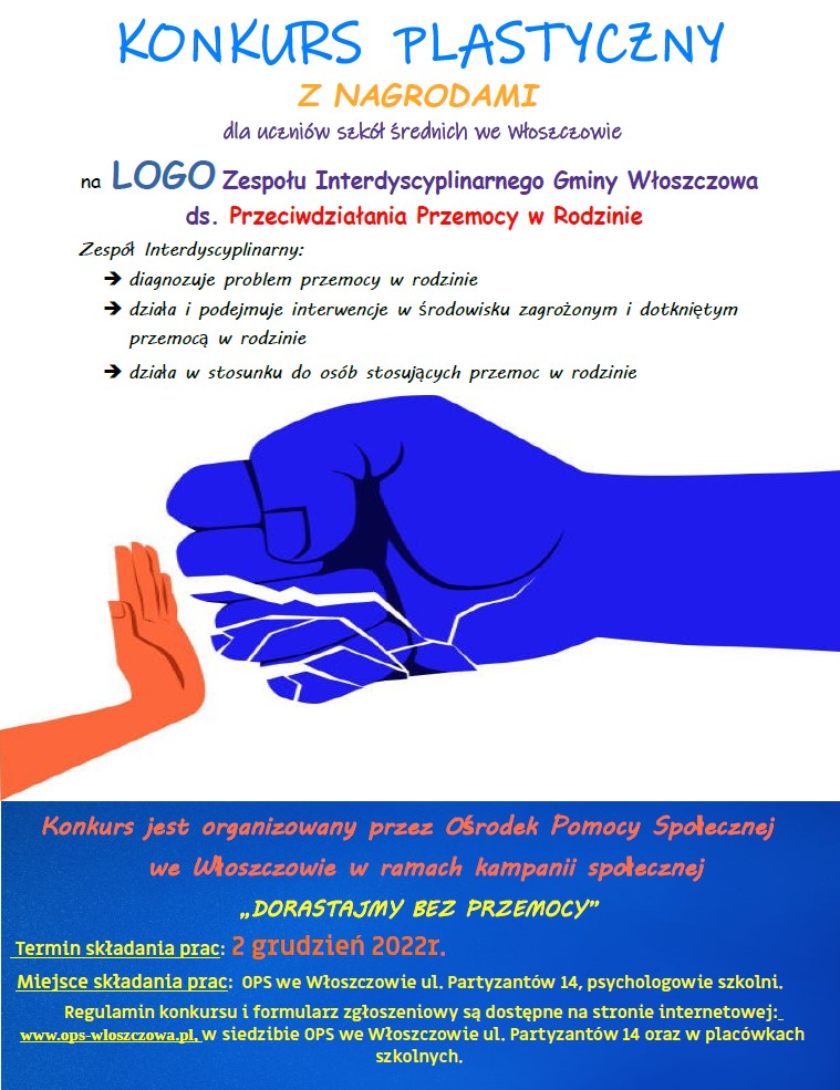 Od dzisiejszego dnia, czyli 16 listopada 2022 r. rozpoczyna się konkurs plastyczny dla uczniów szkół średnich we Włoszczowie na LOGO Zespołu Interdyscyplinarnego Gminy Włoszczowa ds. Przeciwdziałania Przemocy w Rodzinie. Konkurs organizowany jest w ramach naszej listopadowej kampanii społecznej „DORASTAJMY BEZ PRZEMOCY”.
